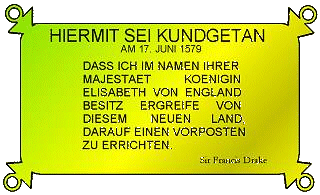 San Francisco vor Anker (er nannte die Gegend "New Albion"), baute ein Fort, ließ sein Schiff ausbessern und hinterließ eine Messingplatte zum Zeichen seines