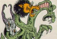 Ein Feuer spuckendes drachenartiges Wesen mit drei Köpfen, einem Ziegen-, einem Schlangen- und einem Löwenkopf. |