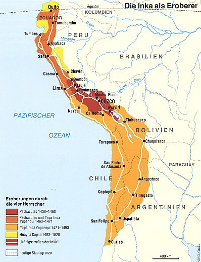 So eroberten die Inka um 1450 ohne große Mühe das Territorium der Colla, die am Ufer des Titicacasees siedelten. Kurz danach nahmen sie die Region von Arequipa bis zur südlichen Küste ein. Weiter gingen die Eroberungen im Norden bis zur Stadt Cajamarca, ca. 1.000 km von Cuzco entfernt. Auch das Chimúreich fiel 1470 in die Hände der Inkas.