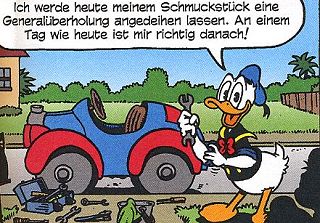 Obwohl er einer der ältesten und wahrscheinlich der beliebteste aller Disney-Charaktere ist, gibt es über Donald Fauntleroy (so sein offizieller zweiter Name) Duck nur wenig gesicherte Informationen. Laut Don Rosa wurden er und seine Zwillingsschwester Della am 9. Juni 1920 als Kinder von Dagobert Ducks Schwester Dortel und Dorette Ducks Sohn Degenhard geboren. Sie wuchsen offenbar in oder in der Nähe von Entenhausen auf, wie zwei Erlebnisse aus Donalds Jugend beweisen. Die erste dieser Szenen zeigt Donald Anno 1930, wie er das erste Mal seinen Onkel Dagobert »trifft« - im wahrsten Sinne des Wortes ( Die Zeit bis in die 1940er liegt völlig im Dunkeln. Jedenfalls wissen wir nicht, wann Donald von zu Hause ausgezogen ist, ob und, wenn ja, welchen Beruf er erlernt hat. Um das Jahr 1943 war er in Mexico, um mit José Carioca und Panchito Pistoles als Immer noch im Clinch liegt er allerdings mit seinem Vetter Gustav und Nachbar Zorngiebel, wobei man sich fragen muss, ob das nicht eher eine Art Hobby oder Sport für beide Seiten ist. Apropos Hobby. Sein liebstes Stück (neben Daisy) ist natürlich Donalds selbstgebauter 313, der aus diversen Oldtimern zusammengebastelt wurde. Gleich danach kommt sein zweitgrößtes Hobby: faulenzen. Beruflich macht er mal dies, mal das. Häufig arbeitet er für seinen Onkel Dagobert, was sich meist auf Münzen polieren oder Packesel bei einer der zahllosen Schatzsuchen seines Onkels beschränkt. Auch Donalds Scharfblick (siehe In |