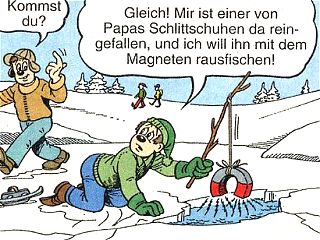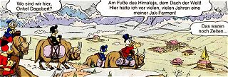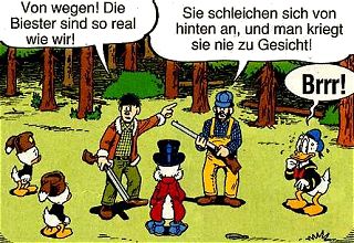 Joe und sein Kollege erklären Onkel Dagobert, dass die Wendigos nicht nur die Arbeiter in der Papierfabrik stören, sondern auch die Touristen in den Wäldern. |