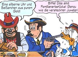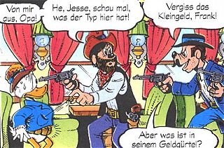 Vollständiger Name: Jesse Woodson James Zusammen mit seinem Bruder Frank und den Banditen Jim, Bob und Cole Younger (und einigen weiteren, wechselnden Mitgliedern) bilden sie die James-Younger-Bande, die am 14. Februar 1866 den ersten Bankraub der Geschichte in der Stadt Liberty begeht. Dabei erbeuten sie 70.000 Dollar. Obwohl keiner der Männer maskiert gewesen ist und man sie gut kennt, verrät niemand der Einwohner ihre Namen, einerseits aus Bewunderung, andererseits aus Angst. Bei einem Banküberfall am 7. September 1876 in Northfield, Minnesota, werden alle drei Younger-Brüder erwischt und bekommen jeweils 25 Jahre Haft aufgebrummt. Anfang 1882 überfallen die James-Brüder einen Zug in Montana, was sie bitter bereuen, denn in diesem Zug befindet sich Dagobert, der ihnen mit einem Trick eins auf die Finger gibt. In einem von Dagoberts Träumen, in den die Panzerknacker eingedrungen sind, steckt Donald versehentlich seine "Gichtgriffel" in Jesses Knarre, worauf der gedemütigt heulend zusammenbricht. Jesse wird 1882 von Gangmitglied Robert Ford in seinem Haus in St. Joseph hinterrücks erschossen. Auf seinem Grabstein ist zu lesen: Ermordet von einem Feigling, dessen Name es nicht wert ist genannt zu werden. Geschwister: Frank James |