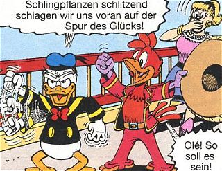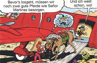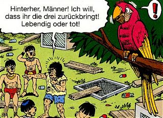 Dieser Papagei merkt sich rein zufällig, was der Indiohäuptling seinen Männern befiehlt, fliegt zu den flüchtenden Caballeros und wiederholt das ganze nach nur einmaligem Hören nahezu einwandfrei. Jedenfalls bringt er damit die Caballeros dazu, sich weiter in die Berge zu flüchten. |