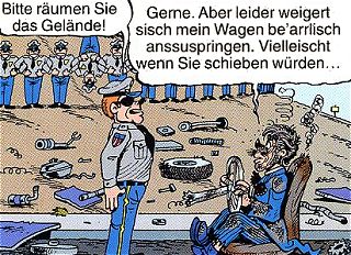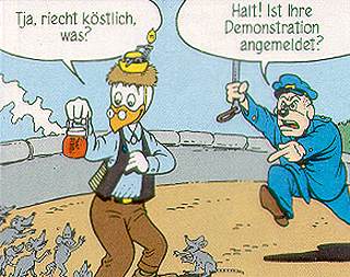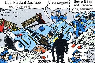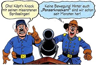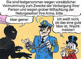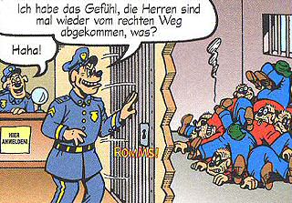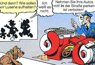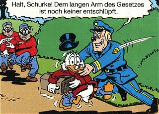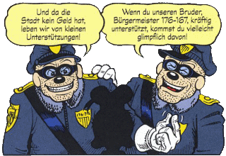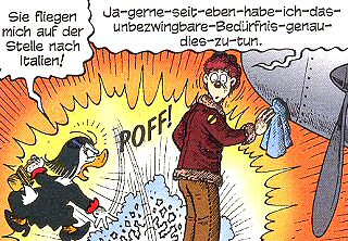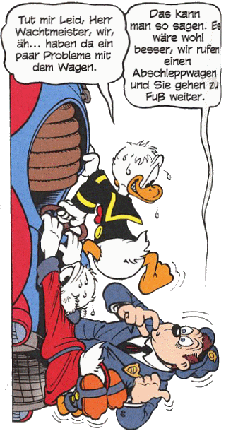 derzeit ziemlichen Kohlmangel. Da er seinen Versteinerungsstrahler inzwischen vernichtet und versehentlich einen Antiträgheits- und Reibewegstrahler erfunden hat, der den Panzerknackern sehr zupass kommt, bekommt er von diesen eine kleine Finanzspritze, damit er sich wieder etwas Kohl kaufen und seine Bemühungen fortsetzen kann. Dass er dabei unbewusst zum Mittäter der Straftaten der Panzerknacker wird, ahnt er nicht im geringsten. |