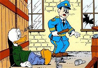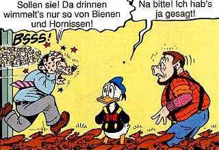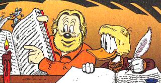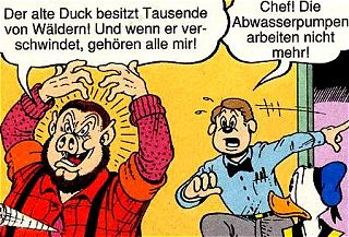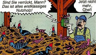 Dieser Angestellte von Dagoberts Papierfabrik in den kanadischen Wäldern schießt zusammen mit seinem Kumpel Joe auf einen vermeintlichen Wendigo, Zwergwesen aus nordischen Fabeln, die gar nicht so fabulös sind. Im Original ist der bärtige Kanadier übrigens dunkelhäutig. |