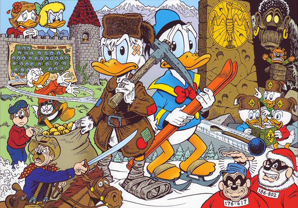 | D.U.C.K.-Widmung | Die Widmung steht gut lesbar auf einem der Flicken auf Dagoberts Jacke. |