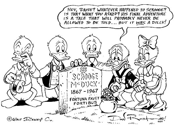 Bemerkungen | Dieses Bild entstand neben vielen anderen als Hommage an Carl Barks anlässlich seines 90. Geburtstags. - Don Rosa schrieb am 3. Oktober 2003 in der DCMLüber die Hintergründe der Illustration: Es war nur einer von vielen Beiträgen für einen Fanzine-Artikel, für den mehrere Künstler gefragt wurden, eine Zeichnung einzureichen, die mit dem SatzHey, Daisy! Whatever happened to Scrooge?zu tun hatte. Andere Leute interpretierten den Satz auf alle mögliche verrückte Arten, aber ich behandelte die Frage in dem Sinne, dass ich mir überlegte, was mit Dagobert im Ganzen passierte. Dadurch, dass die Zeichnung auf Websites und in Magazinen auf der ganzen Welt aus dem Kontext gerissen wird, glauben die Leute, ich hätte dies nur gezeichnet, um der Welt zu zeigen, dass Dagobert tot ist. Und obwohl ich denke, dass er im Jahre 2003 logischerweise und unvermeidlich tot sein muss, versuche ich nicht, Ärger zu machen, indem ich solch grausame Cartoons zeichne. Vermutlich hat Don das Todesjahr 1967 für Dagobert - im