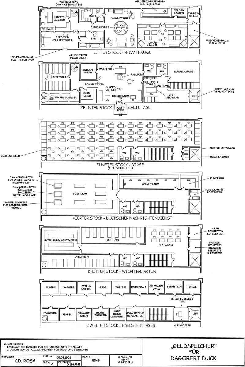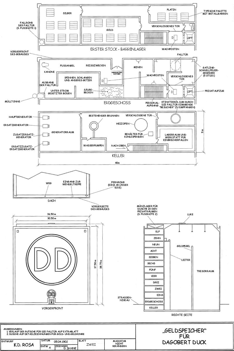 Wer schon immer mal wissen wollte, wie es in Onkel Dagoberts Geldspeicher wirklich aussieht, ob sich im Keller mehr befindet als Spinnen und Mäuse und wie Dagobert Ducks Privaträume aussehen, der findet hier - erstmals auf deutsch - die Blaupausen des Geldspeichers, die auch im OD-Album 27 abgedruckt wurden (dort allerdings im Original).