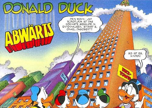 HintergrundinfosAllgemeinesEs gibt im gesamten Comic keinen einzigen offiziellen Hinweis auf die Anzahl der Stockwerke. Der Wolkenkratzer ist einfach »groß« und hat mehr als 73 Stockwerke. Wie komme ich aber nun auf 83 Stockwerke? Nun, auf Seite 2 Bild 8 drückt Donald im Aufzug einen Knopf. Er landet daraufhin auf Seite 3 Bild 2 im 73. Stock. In jedem deutschen Lift ist die Stockwerkfolge U, E, 1, 2, 3... im Lift von unten nach oben, was ja auch irgendwie logisch ist. Wenn also der Knopf, auf den Donald drückt, die 73 ist, addiert man zu dieser Zahl die folgenden Knöpfe (10) und heraus kommt 83. Beweisführung: Na klar, Don Rosa kann sich diesen Unsinn auch aus den Fingern gesogen haben, es kann auch Zufall sein, aber wenn wir uns noch einmal die Knöpfe am Lift ansehen...