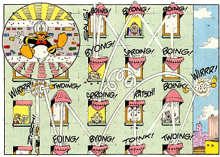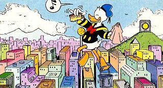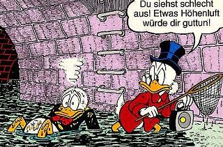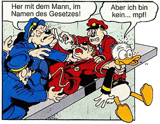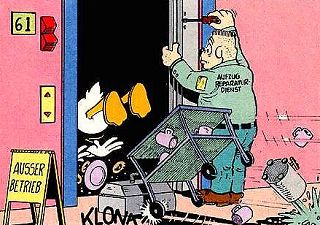 KommentarDies ist wieder eineEin Meister seines Fachs-Geschichte, die einmal mehr zeigt, dass Überheblichkeit gefährlich sein kann, selbst wenn man wirklich gut ist. Denn erst durch Leichtsinn (und einen vergessenen Handgriff beim Gurt befestigen) kommt es zu Donalds wilder Rutschpartie, durch die man nebenbei auch noch einen guten Teil des Duck-Towerskennen lernt. Neben Donalds Slapstick-Einlagen brilliert die Story auch durch die vielen Hintergrund-Gags und einen erstaunlich bissigen Humor (Das Duck-Tower-Sicherheitspersonal, nachdem es den SelbstmörderDonald fallengelassen hat: Wie sieht das auf unserem Gehweg aus?). Erstaunlich ist, dass die eigentlich simple Grundidee (Anschnallen vergessen = tiefer Sturz) ohne Längen auf zehn Seiten unterhalten kann. Eine kurze, äußerst witzige Action-Gagstory: 2 |