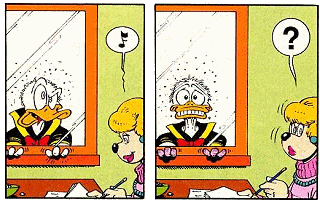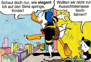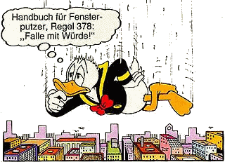 (vermutlich) zu einer Kollegin: Alle anderen Büros im 71. Stock sind leer und deshalb die Fenster verschlossen. Da beschließen Donalds Neffen, den mutigen Fensterputzer an einem Löschschlauch hochzuziehen. Der Schlauch verheddert sich unglücklicherweise am Hebel für die Wasserzufuhr und mit einem KLACK! tanzt der Schlauch mitsamt Donald unter dem großen Wasserdruck. Als Tick, Trick und Track endlich das Wasser abgestellt haben, fällt Donald elegant auf einen Sims im 63. Stock. Mit dem Gedanken Die Neffen des Die Kinder sind wenig später bei ihm. Donald ist leicht verletzt, sein