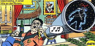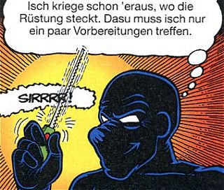 umfangreiche Trophäensammlung zu sehen, da er seine Als jemand um ein Gespräch mit Dagobert bittet, stellt er schockiert fest, dass es sich dabei um den Franzosen Arpin Lusene handelt - den Schwarzen Ritter, der es natürlich mal wieder auf Onkel Dagoberts Reichtümer abgesehen hat... |