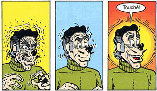 Fortsetzung einer von Dons Geschichten, also von Die Geschichte ist, wie für Don Rosa typisch, wieder ziemlich witzig und stellenweise recht bizarr, schafft es aber stellenweise nicht, flüssig zu sein – durch verschiedene Erklärungen zur Vorgeschichte entstehen teilweise Längen. Andererseits gewinnt sie durch eine Art gegenseitige Wertschätzung von Dagobert und Lusene, die am Ende deutlich wird, noch eine gewisse Tiefe und enthält zudem so manche überraschende Wendung. Die Zeichnungen sind, wie bei Don Rosa üblich, sehr detailliert, einige Seiten wirken durch die hohe Anzahl der Bilder aber überfrachtet, außerdem gibt es durch die daraus folgenden kleinen Bilder leider nur sehr wenig Platz für Witziges im Hintergrund. Abschließend hat Don meiner Meinung nach den Handlungsfluss des Vorgängers nicht ganz erreichen, dafür aber dem Leser ein abwechslungsreicheres, tiefgehenderes Bild des Schwarzen Ritters und seines Verhältnisses zu Dagobert bieten können. Lustig und facettenreich, stellenweise aber recht langatmig: 2 |
