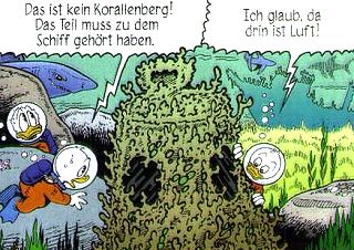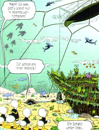So gab es schon im 16. Jahrhundert Schatzsucher, die mangels Taucheranzug die auf den untergegangenen Schiffen liegenden Schätze, die für sie zugleich nah und doch unerreichbar waren, nur von Weitem sehnsuchtvoll aus der Taucherglocke sehen konnten. Trotzdem kartographierten sie sorgfältig die Lage der Schiffe, um sie später doch irgendwann mal bergen zu können, wenn die entsprechende Ausrüstung erfunden sein würde. In der Er lässt nach Dagoberts Zustimmung eine Glaskuppel per Hubschrauber