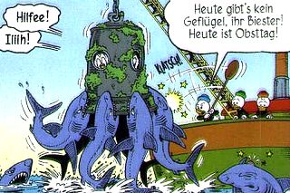 einfliegen, die über die Doch wieder versalzt Käpt'n Kuda, der Dagobert inzwischen als reichsten Mann der Welt erkannt hat, ihnen die Suppe. Er fesselt den oben auf dem Schiff die Tauchaktion seiner Neffen überwachenden Dagobert, klaut die Kamera mit den Bildern der Karte, zerstört die Taucheranzüge und stellt die restlichen Ducks vor ein ähnliches Problem wie den Oberkommandeur der spanischen Bergungsflotte: Ihr Ziel ist so nah und durch die Haie, die ständig auf Beute wartend in der Nähe umherschwimmen, doch so unerreichbar. Als sie sich gerade überlegen, ob sie trotz der Haie versuchen sollten,