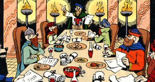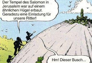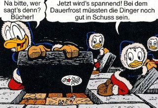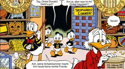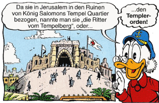 Hintergrund-GagsDonald nimmt das Staubwedeln auf der zweiten Seite der Geschichte sehr genau. Auf Seite 12 stibitzt eine Maus während eines Essens der Templer eine Olive. |