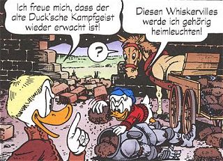 InhaltMitten in den schottischen Hochmooren steht seit dem 17. Jahrhundert die trutzige Duckenburgh, die heute nur noch von Adlern, Spinnen und Ratten bewohnt wird. Wir schreiben das Jahr 1877. Dietbert Duck hat seinen fast zehn Jahre alten Sohn Dagobert mit zum Stammsitz des Duck-Clans genommen, um ihn an seine Vorfahren zu erinnern. Er erzählt seinem Sohn, dass der Clan im Jahre 1675 von einem riesigen Hund aus der Burg vertrieben wurde. Danach ging es stetig bergab. Anno 1753 geriet Käpt'n David Fürchtegott Duck an einen Gauner namens Schubiack, dem es gelang, ihm sein ganzes Vermögen abzuluchsen - bis auf sein goldenes Gebiss und eine Taschenuhr. Seither lebt der Clan in großer Armut in der schottischen Hauptstadt Glasgow und die Whiskervilles haben sich in den Mooren um die Duckenburgh breit gemacht, um dort ihre Schafe zu weiden. Just in dem Moment, als ein Whiskerville Vater und Sohn von ihrem Land vertreiben will (und sich Dietbert kampfbereit macht), ertönt ein markerschütterndes Geheul, das die beiden Ducks das Weite suchen lässt. Als die Beiden außer Reichweite sind, nimmt einer der Whiskervilles eine riesige Hundemaske ab und freut sich, dass der Trick noch genau so gut klappt wie 200 Jahre zuvor. Daheim in Glasgow gibt es eine Krisensitzung. Dagobert meint, man dürfe