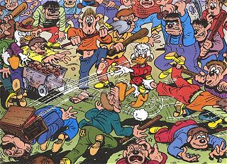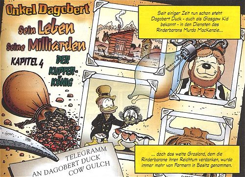 KommentarMal wieder ein gelungenes SLSM-Kapitel, welches am Anfang sogar in unsere Zeit passt (Arbeitslose). Der Höhepunkt der Story, in dem Dagobert allein gegen alle kämpft, ist eine Art Einleitung in das harte Leben, das er noch vor sich hat. Es ist das erste Mal, dass er sein Recht verteidigen muss. Auch zeigt sich bereits seine Wut, die ihn zu einem großartigen Kämpen macht. Dabei ist es sehr wichtig, dass Dagobert kämpfen und sein Recht verteidigen kann, denn wenn er es nicht könnte, so könnte er auch keine für ihn wichtigen Siege (wie zum am Klondyke) erringen, die ihn zur reichsten Ente der Welt machen werden. Und nur so wird er schlauer als die schlauesten und zäher als die zähesten. Andere Erfahrungen, die für seinen weiteren Lebensweg wichtig sein werden, macht Dagobert in dieser Story ebenfalls, so zum Beispiel lernt er, dass Freundschaft durch Reichtum gebrochen werden kann, was er in seinem Leben leider nur zu oft erleben wird. Dieses Kapitel ist gerade deshalb ein Meilenstein in Dagoberts Leben, da er diese wichtige Lektion lernt, aber auch deshalb, weil er das goldene Gebiss seines Vorfahren David Fürchtegott Duck verkauft und weil er zum ersten Mal Klaas Klever trifft. Natürlich sind wie immer bei Don Rosa geschichtliche Ereignisse eingeflochten,