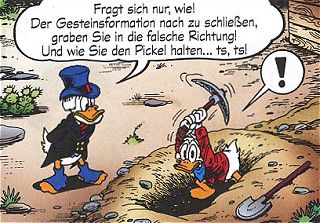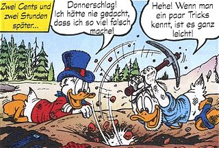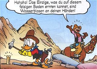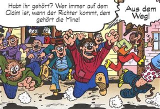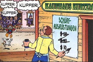 InhaltDer junge Dagobert verliert nach einem Jahr seine Arbeit als Cowboy. Doch mutig, wie er ist, versucht er sein Glück als Schürfer. Bald findet er Kupfer, doch leider ist dieses nichts wert. Bedrückt genehmigt er sich einen Teller Linsen, die er versucht, mit der Gabel zu essen (das klappt natürlich nicht und so werden die Linsen über den ganzen Tisch verteilt). Während des Essens versucht er zusammen mit seinem Tischnachbarn die seltsame Petroleumlampe über dem Tisch anzuzünden. Die beiden wissen nicht, dass es sich dabei um eine der ersten elektrischen Lampen handelt. Thomas Edison ( der Erfinder der Glühbirne) lässt überall im Land elektrische Leitungen verlegen. Und diese bestehen aus Kupfer, das seither im Wert enorm gestiegen ist. Als die verzweifelten Goldschürfer dies hören, beschließen sie spontan, nach Kupfer zu graben und es beginnt ein Wettrennen um die Schürfausrüstungen, deren Preis sich plötzlich verzehnfacht hat. Nun muss Dagobert sich wohl oder übel von einem Familienerbstück trennen, um weiterhin dabei sein zu können. (Edouard) |