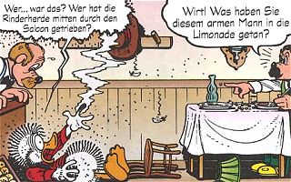 taucht erstmals in Hintergrund-GagsAuf Seite 11 in Panel 5 sammelt jemand seine Zähne ein. Als Burt auf Seite 4 die Elektridingsda aus dem Saloon in einen Eimer gefegt hat, kippt er alles aus dem Fenster, unter dem eine Katze sitzt, die das ganze Zeug abkriegt. In Panel 4 auf Seite 10 zieht Dagoberts Pferd Dortel beleidigt ab und wird auch nicht mehr gesehen. |