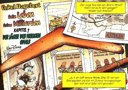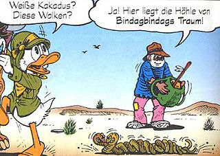 Es beginnt damit, dass Dagobert einen Aborigine in der australischen Wüste vor einem Wüstenräuber rettet. Zum Dank nimmt ihn der Gerettete, der sich als Jabiru Kapirgi vorstellt, zu einer Traumhöhle mit, die gut versteckt unter dem Sand liegt. In der Höhle, in welcher der Aborigine-Schamane die alten Wandmalereien liest, befindet sich auch ein riesiger Opal, den sich kurz darauf der zurückgekehrte Wüstenräuber unter den Nagel reißt und darauf das Weite sucht. Klar, dass Dagobert die Verfolgung aufnimmt ... |