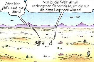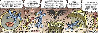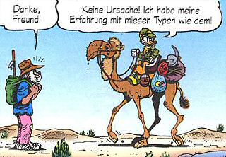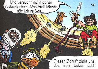 auf einem Kommentar Dagoberts in Hintergrund-GagsAuf der dritten Seite besabbert Dagoberts Dromedar Jabbys Zeigefinger. Auf Seite 4 bekämpfen sich zwei Schlangen. Der Verlierer bekommt eine Schleife in den Körper. Die Hände auf Seite 6 sehen teilweise etwas seltsam aus. Eine überkreuzt Zeige- und Mittelfinger (versucht das mal), eine hat sechs Finger und eine macht den vulkanischen Gruß. Auf der letzten Seite klaut eine Elster Jabbys gesamtes Geschirr. |