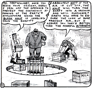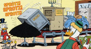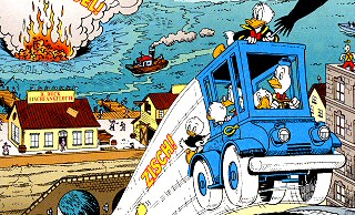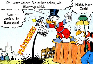 Dons KommentareDon in der HOF 14: Barks-Reminiszenzen (und andere)Die Kullern stammen aus Barks' Hintergrund-GagsAuf Seite 6 wird neben dem ganzen Mobiliar auch ein Vogel vom Luftstrom des Blankweg™-Lochs angesogen, der daraufhin davontorkelt. Auf dem ersten Bild auf Seite 21 der Geschichte sonnt sich eine nackte Frau auf einem Hausdach (allerdings auf dem Bauch liegend). Sie wird übrigens beobachtet. |