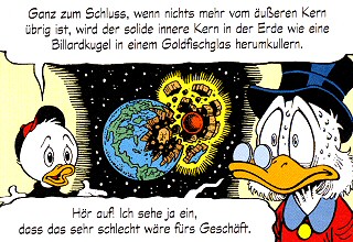 InhaltDie Ducks müssen zum Mittelpunkt der Erde reisen, um einen Alleslöser einzufangen, der sonst eine globale Katastrophe auslösen könnte. Erfunden wurde der Blankweg™ genannte Stoff von Daniel Düsentrieb - im Auftrag Onkel Dagoberts, der damit den Bergbau revolutionieren will. Zur Demonstration der Wirkungskraft des Alleslösers kippt Onkel Dagobert den Inhalt des Diamantbehälters (der einzige Stoff, den das Blankweg™ nicht auflöst), in dem sich eine Probe des Stoffs befindet, einfach vor den versammelten Presseleuten auf die Wiese vor dem Geldspeicher. Ein fataler Fehler, denn von nun an frisst sich das Blankweg™ unaufhaltsam ins Erdinnere vor, wo es den flüssigen Erdkern völlig auflösen könnte. Die Ducks machen sich also auf zu ihrer persönlichen Reise zum Mittelpunkt der Erde... |