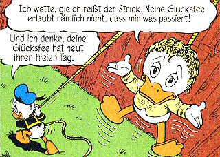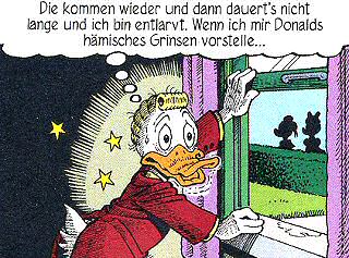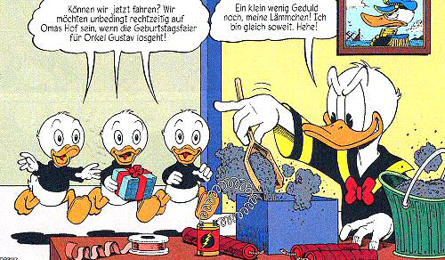 KommentarDiese recht übertriebende Geschichte aus Dons Feder ist ein Feuerwerk an Gags und dreht das von Barks bekannte Bild des glücklichen Gustav. Neben einigen Bezügen auf das SLSM, die sicher für einen Rosa-Liebhaber perfekt einzuordnen sind, bleibt die Story doch in dem Rahmen das auch ein Rosa-Laie sich vor Lachen zu Boden wirft (bitte nicht ernst nehmen). Auch in dieser Story glänzt Rosa mal wieder mit seinen Zeichenkünsten. Zur vollen Geltung kommen diese beispielsweise bei dem Kometen. Aber was schreib ich da, die ganze Story ist gut gezeichnet. Diese Story zentriert sich vor allem auf den familiären Bereich der Ducks. Mit vielen Hintergrundgags führt Rosa noch einmal die familiären Spannungen und Beziehungen auf (siehe Dortel und Degenhard), die im SLSM dem Leser offenbart werden. Der Humor kommt in dieser Geschichte (wie auch in allen anderen Rosa-Storys) natürlich nicht zu kurz. Durchweg kann man sich auf Gags freuen, wenn auch teils recht Übertriebene, was umso mehr zeigt, das diese Story keineswegs ernst zu nehmen ist. Vielleicht wird es einige interessieren, dass das Zeichen des Distelfinks eine Ableitung von den Distelfinken ist, welche deutsche Siedler im 17. Jahrhundert auf ihre Scheunen in Pennsylvania gemalt haben. Eine recht amüsante Kurgeschichte zu Gustavs 50. - Für ein paar gereizte Lachmuskeln reicht diese Story auf jeden Fall: 2 (Edouard) |