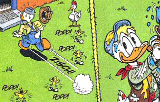 Donalds Auf S.12, Panel 1-6 ist ein Huhn, was eine Spur von Eiern hinter sich herzieht. In Panel 6 schlüpfen aus allen Eiern Küken. Auf S. 14, Panel 3 wird eine Kuh vom Blitz getroffen. |