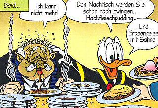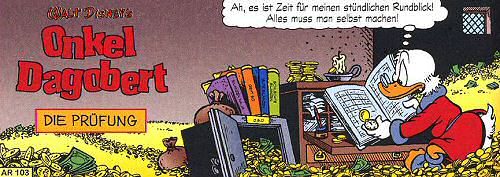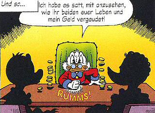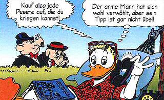 InhaltUm festzustellen, wer geschäftstüchtiger ist, gibt Onkel Dagobert Donald und Gustav je 1000 Taler, die die beiden gut anlegen sollen. Donald will sogleich beim Burger-King Willi Würgerking investieren, den er jedoch beim Geschäftsessen so voll stopft, dass dieser nie wieder etwas von Essen hören will. Auch sein nächster Versuch ist eher erfolglos: Donald hat einen Klippenrand gekauft: zwei Hektar soliden Felsgrund. Gustav indessen tätigt ein gutes Geschäft nach dem anderen: Er investiert in neuartige Teppichfasern und spekuliert an der Börse. kann Donald seinen Vetter noch einholen? |