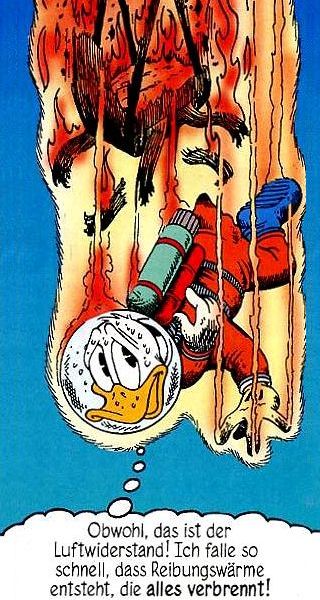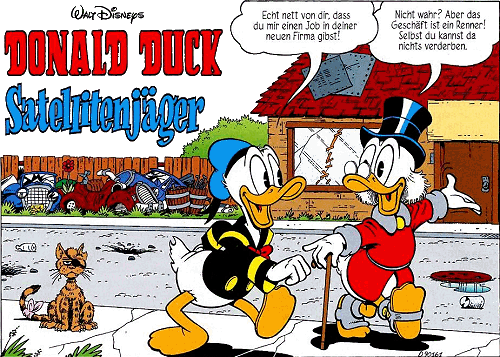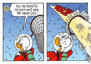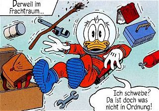 InhaltDonald freut sich, dass Onkel Dagobert ihm einen Job verschafft hat, Natürlich sind auch die Raumanzüge und die Gurte schon gebraucht, was Donald schmerzhaft zu spüren bekommt. Im All dann soll er den Satelliten, der über Entenhausen abstürzen soll, einfangen, und zwar mit einem Fischernetz - welches prompt aufgrund der Geschwindigkeit des Satelliten von 10.000 km/h zerreißt. Man sucht nach einer Möglichkeit, den Satelliten anderweitig einzufangen, aber man benötigt, laut Professor von Schaum, die gleiche Geschwindigkeit wie der Satellit und somit auch jede Menge Treibstoff. Dagobert gibt entnervt wegen der Kosten für diesen Treibstoff auf und schaltet die Triebwerke aus, um zurück nach Hause zu fliegen. Ein folgenschwerer Fehler. Dadurch stürzt das Flugzeug zu abrupt auf die
