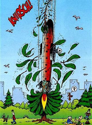 Seine gesamte Ausrüstung funktioniert nicht, Donalds Fallschirm fängt genauso Feuer, als Donald plötzlich eine Idee hat. Er richtet die Raketen auf seinem Rücken nach unten, sodass die Reibungswärme sie entzündet. Somit wird sein Sturz gebremst. Sein Schicksal können inzwischen Millionen Fernsehzuschauer auf den Satellitenbildern der Wetterkarte verfolgen. Im Flugzeug wirft Dagobert einen Feuerlöscher durch das Frontfenster, was zur Folge hat, dass sich das Flugzeug wegen des veränderten Luftwiderstandes dreht und mit dem Heckflügel voraus auf einer Tanne (!) notlanden kann. Dagobert erklärt entnervt das Projekt für gescheitert und entlässt Professor von Schaum. Doch Donalds Schicksal ist noch ungewiss. Sein Treibstoff geht aus. Mittlerweile suchen Onkel Dagobert und Professor von Schaum nach Donald, als Fräulein Rührig ihren Chef ruft und ihm mitteilt, dass Donald aus Mausdorf anruft. Während Dagobert sich fragt, wie Donald dorthin kommt, befürchtet Professor von Schaum das Schlimmste: dass Donald in eine Raum-Zeit-Krümmung geraten ist. Der Polizist teilt Donald mit, er würde wegen Landstreicherei für acht Tage ins Gefängnis müssen. Dagobert, der sich auf Professor von Schaums Theorie, Donald wäre um acht Tage in die nächste Woche geflohen, stützt, teilt ihm mit, er könne sich den Lohn für diese acht Tage abschminken. |