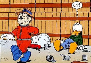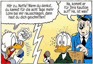 Im TGDD mutiert Dagobert im ersten Panel der letzten Seite zum Marsmännchen, weil jemand bei der Kolorierung nicht aufgepasst hat. |