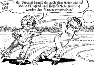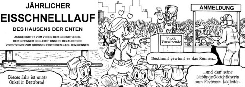 InhaltDonald nimmt am jährlichen Eisschnelllauf teil, bei dem der Sieger die Vorsitzende vom Verein der Gedichtleser, Daisy, beim Festessen begleiten darf. Allerdings gibt es für Donald auch harte Konkurrenz: Gustav, der ewige Glückspilz nimmt ebenfalls am Rennen teil. Wie das Ganze ausgeht, wird an dieser Stelle nicht verraten. |