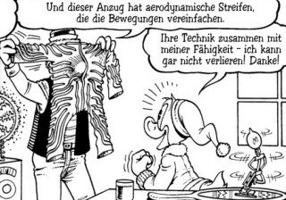 Geschichte 1998 quasi als Barks-Reminiszenzen (und andere)Das Flugrad, das vor Düsentriebs Labor schwebt, stammt ausDie störriche Störchin(FC 1047) von Carl Barks. |