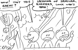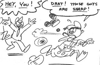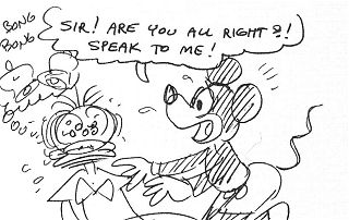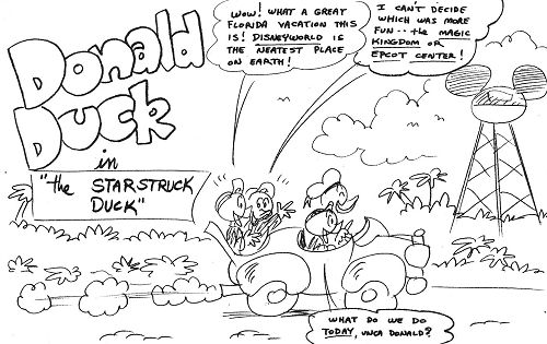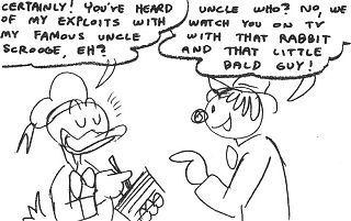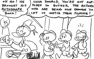 zu vollenden. Hier seine Antwort: Hintergrund-GagsKein Hintergrund-Gag (dafür sind die Skizzen viel zu... äh, skizzenhaft), aber ein Insider-Gag: Der Autogrammjäger auf Seite 3 verwechselt Donald mit Daffy Duck. |