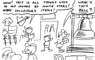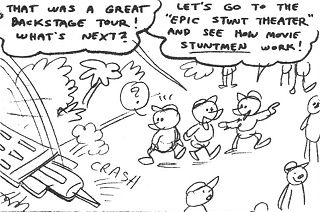 KommentarDiese Geschichte ist etwas besonderes. nicht nur, weil sie Don-Rosa-untypisch in der Gegenwart spielt, sondern auch, weil es die einzige Don-Rosa-Story ist, in der Micky Maus auftritt. Umso bedauerlicher ist es, dass sie nur als ziemlich grob gezeichneter Entwurf existiert, weshalb sich zumindest über Dons Zeichenqualitäten in diesem Fall gar nichts sagen lässt. Also konzentrieren wir uns voll auf die Geschichte, und die hat es in sich. In erster Linie war sie als Werbestory konzipiert (siehe auch Don Rosas Kommentar zu der Geschichte) und zeigt sich auch durchgehend als solche. Dabei wird Donalds Verfolgungsjagd als Aufhänger für eine Tour benutzt, die quer über das Gelände der MGM-Studios führt und die wichtigsten Attraktionen (Vorstadtkulisse, Stunt-Show, Trickfilmstudio und so weiter) vorstellt, die Donald natürlich kräftig durcheinander bringt. Donalds Neffen kommentieren überschwänglich und werbewirksam jede Attraktion