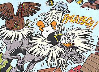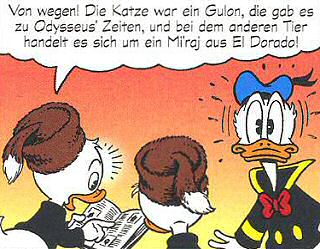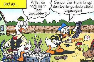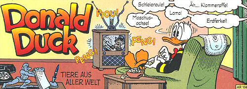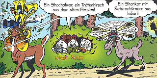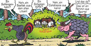 KommentarRosas dritte Geschichte ist ebenfalls ein Zehnseiter und kann das erste Mal mit richtig viel des übertriebenen Humors aufwarten, für den wir Don Rosa alle kennen und mögen. Da hält Donald beispielsweise allen Ernstes stur eine Kuh für eine Thompsongazelle, als er den Neffen zeigen will, wie sehr er sich in Zoologie auskennt. Und als er ihnen zum wiederholten Male kein unbestimmbares Tier vorsetzten kann, hämmert er vor Wut seinen Kopf gegen einen Baum, was die pflichtbewussten Neffen natürlich gleich für das Werk eines Riesenbibers halten und gewissenhaft notieren. Historische Informationen erhalten wir selbst in dieser Gagstory, nämlich über die Fabelwesen und ihre Geschichte, aber das nur am Rande des Comics, dem es natürlich an der Tiefe und Komplexität der heftfüllenden Rosa-Geschichten fehlt. Auch in seiner dritten Disneygeschichte ist Rosas Zeichenstil noch etwas holprig, wird aber zunehmend sicherer und detaillierter. Die in sich schlüssige Handlung verläuft recht flott und die Spannung wird durch Donalds immer abstrusere Tierkreationen aufrechterhalten und verstärkt, um zu einem action- und humorgeladenen Ende zu führen. Die allwissenden, aber zugleich leichtgläubigen Neffen werden vom kindischen Onkel beneidet – Rosas Charakterisierung ist hier wirklich gelungen, und, was gut zur witzigen Geschichte passt, absichtlich etwas überzogen (siehe erster Absatz). Eine skurrile und durchgeknallte Geschichte: 2+ |