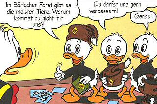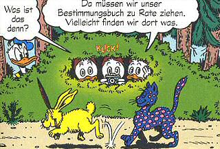 InhaltDonalds Versuche, seinen Neffen die Tierbestimmung für Fähnlein Fieselschweif zu vermiesen, enden in einem Desaster. Tick, Trick und Track wollen für die Tierbestimmungsprüfung des Fähnlein Fieselschweif üben, um sich danach E.B.F.F.W.F. nennen zu können. In Donalds Begleitung geht man in den Bärlocher Forst. Doch ersterer, der sich