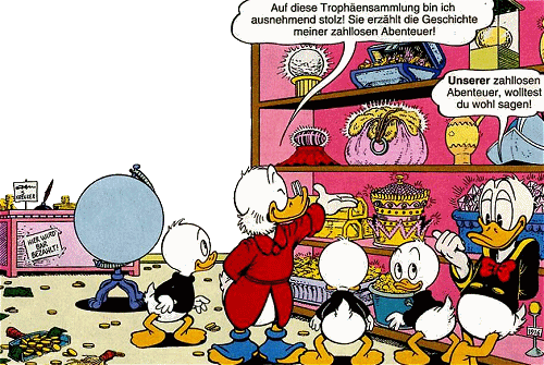 InhaltDie Trophäensammlung von Dagobert Duck ist sein ganzer Stolz. Sie erzählt von wilden Seefahrten auf der Suche nach dem Gold vom Fliegenden Holländer, präsentiert den kostbarsten Edelstein der Erde (den Rosa gestreiften Rubin), erinnert an vergangene Erfolge seinerzeit am Yukon... alles Abenteuer, die der reichste Mann der Welt meistern musste. Glücklich präsentiert er seinen Neffen und Großneffen das Herzstück seines