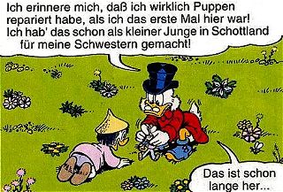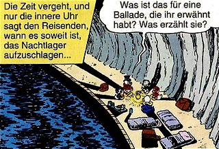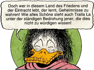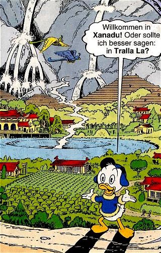 Gedicht namens Ebenfalls bemerkenswert ist, dass Don Rosa an (fast) jeder erdenkbaren Stelle das Zeichen von Xanadu / Tralla La, den liegenden Halbmond unter einem Kreis, gezeichnet hat. Familie Duck sieht so ähnlich aus wie das Tralla La-Volk, der große Unterschied ist jedoch die Anzahl der Finger: Während Dagobert und Konsorten mit vier Fingern noch als »anständig« bezeichnen kann, haben die Trallalaner fünf (!) Finger, woran man erkennt, dass sie nicht miteinander verwandt sind. |