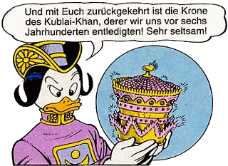 Geldspeichers, dass seine zahllosen Abenteuer erzählt. Diese lässt nicht lange auf sich warten: Am Fuße des Himalaja in Tibet findet er sich auf einem Jak wieder. Dagobert Duck und seine nächsten Anverwandten reiten zu einer Art Siedlung, wo ihnen Schumlei Kum, der Besitzer der ehemaligen Duckschen Jak-Farm, entgegenkommt und sie willkommen heißt. Nachdem er Dagobert Duck wiedererkannt hat, fragt Dagobert ihn, wo er die Krone des Dschingis Khan gefunden habe. Er berichtet von einer Eishöhle im Karakorumgebirge. Da der Farmer sein Wissen nur im Austausch der Jaks der fünf Ducks