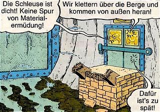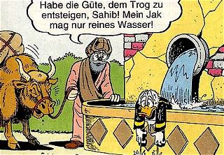 des dort liegenden Dorfes ihnen aus dem Wasser hilft, schmerzt Dagobert der