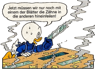 ( Indessen benutzt Donald schon das letzte Sägeblatt und atmet das letzte