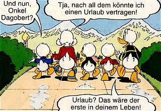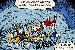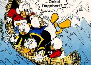 gelangen kann - auch er nicht. Nach stundenlanger Fahrt durch die tosenden Fluten (bei der Dagobert