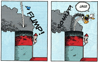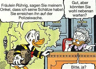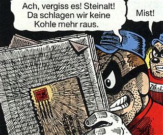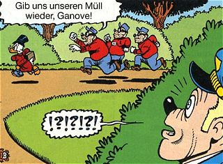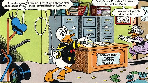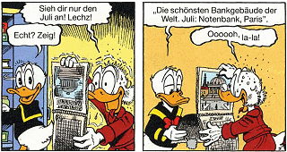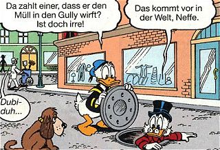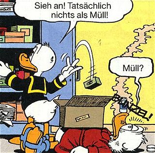 Zeitung aus der Mülltonne fischen soll), liest Dagobert in der Zeitung vom Vortag