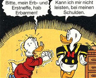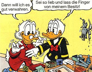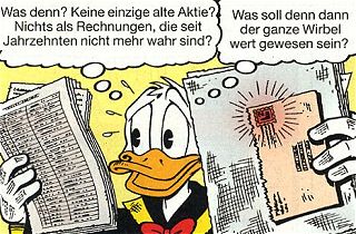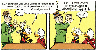 darauf und meint zufrieden: Als ein Herr vom Auktionshaus kommt, den Dagobert eigens herbestellt hatte, muss er also mit Donald verhandeln. Dabei begeht Dagoberts Erbneffe einen folgenschweren Fehler. Er präsentiert dem Auktionator die wertvolle Briefmarke und schiebt im gleichen Atemzug den restlichen Krempel in den Mülleimer. Doch welch eine Enttäuschung: Der Auktionator hält die wertvolle Marke für gar nicht wertvoll: Ziemlich häufig sei sie, und noch dazu im schlechten Zustand, höchstens einen Taler wert. Donald versteht die Welt nicht mehr, doch Dagobert holt zufrieden grinsend den wahren Schatz aus dem Abfalleimer.