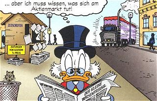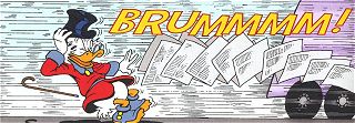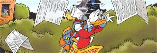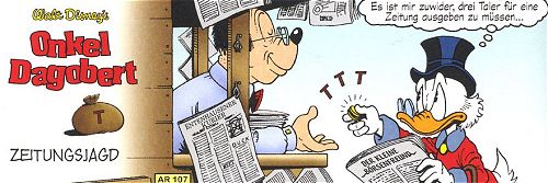 InhaltDagobert kauft widerwillig eine Börsenzeitung, die ihm der Fahrtwind eines vorbeirasenden Lasters aus der Hand reißt und in alle Winde verstreut. Da die Zeitung enorm teuer war (ganze drei Taler), jagt er den Blättern quer durch Entenhausen nach. |